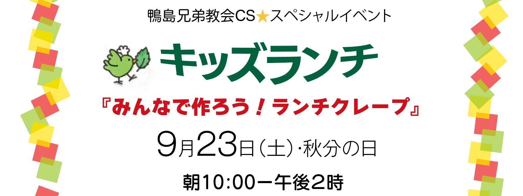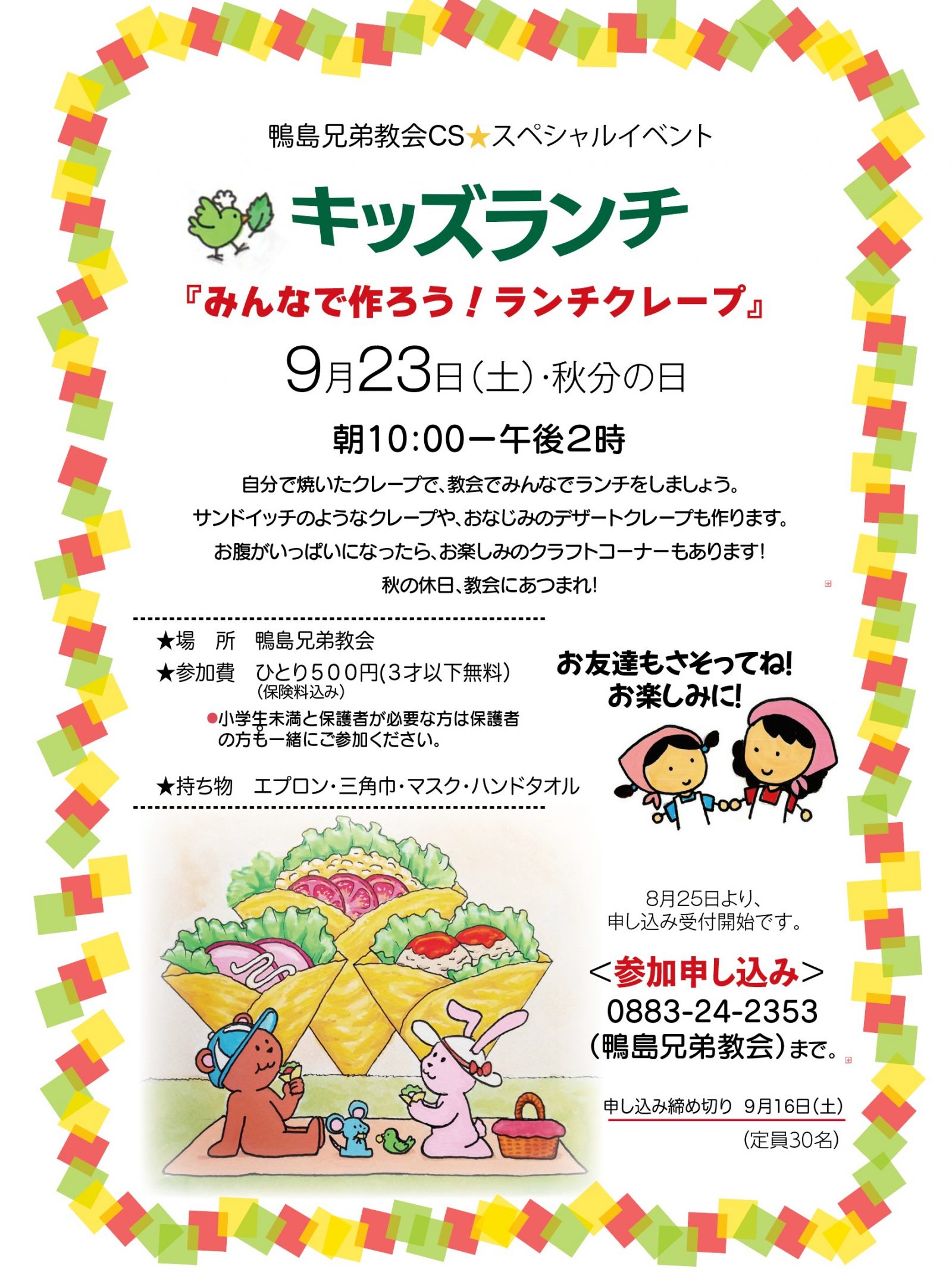 キッズランチ 投稿日 2023年8月25日 更新日 2023年9月15日 著者 鴨島兄弟教会 カテゴリー イベント・お知らせ ★募集人数に達しましたので今回の受付は締め切りました。また次回をお楽しみに! 鴨島兄弟教会CS⭐️スペシャルイベント 『みんなで作ろう!ランチクレープ』 9月23日(土)・秋分の日 朝10:00ー午後2時 自分で焼いたクレープで、教会でみんなでランチをしましょう。サンドイッチのようなクレープや、おなじみのデザートクレープも作ります。お腹がいっぱいになったら、お楽しみのクラフトコーナーもあります!秋の休日、教会にあつまれ! イベント 鴨島イベント 鴨島兄弟教会 鴨島兄弟教会イベント